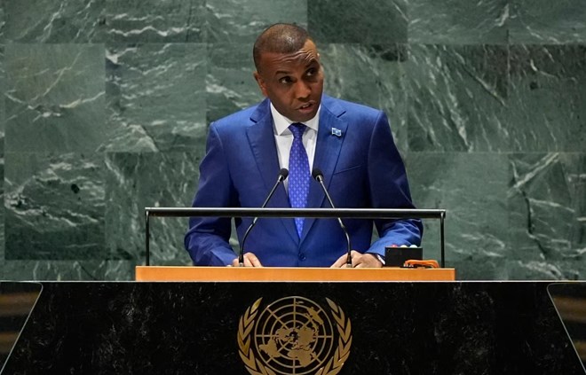 FILE – Somalia’s Prime Minister Hamza Abdi Barre addresses the 79th session of the United Nations General Assembly, Sept. 27, 2024.