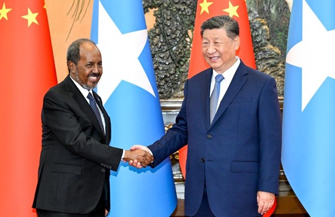 Somali President Hassan Sheikh Mohamud (left) shakes hands with Chinese President Xi Jinping (right) during a meeting at the 2024 Forum on China-Africa Cooperation (FOCAC) Summit in Beijing. The two leaders discussed strengthening bilateral ties and officially announced the elevation of China-Somalia relations to a strategic partnership.