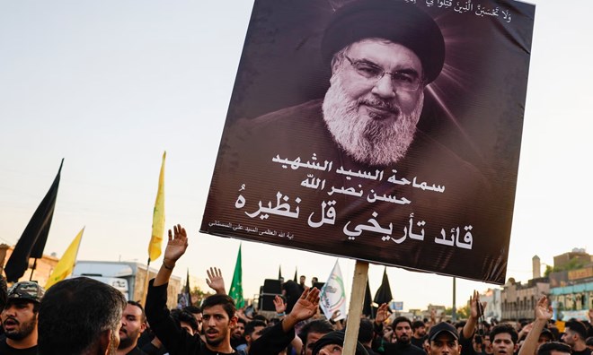 Mourners beneath a placard of Hassan Nasrallah, who was killed by an Israeli airstrike in Beirut, during a symbolic funeral in Baghdad, Iraq on Sunday. Photograph: Thaier Al-Sudani/Reuters