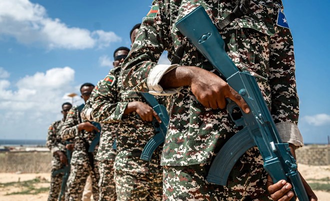 Troops take part in the Somali Army Cadet Officers Course at the General Dhagabadan Training Centre in Mogadishu on March 19. Photographer: Amaury Falt-Brown/AFP/Getty Images.