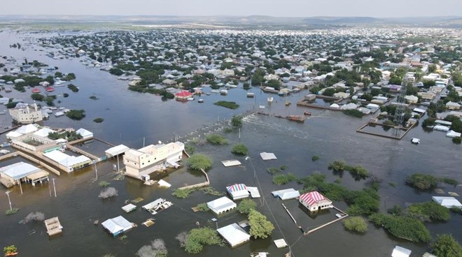 This aerial photo shows a view of flood-hit Beledweyne, central Somalia, Nov. 20, 2023. (Photo by Abdullah Boyow/Xinhua)