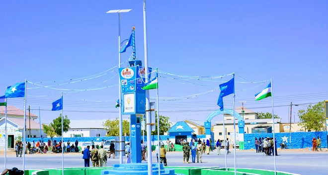 FILE – Garowe city center, Puntland, Somalia, featuring local security forces and residents around the iconic monument. Photo via Wikimedia Commons.