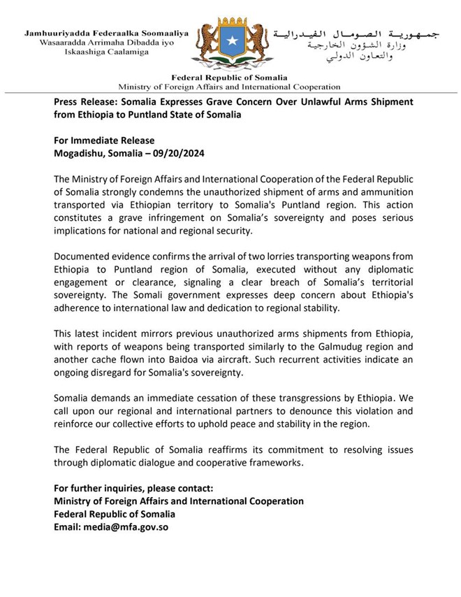 In a statement released Friday, the Ministry of Foreign Affairs and International Cooperation said two trucks carrying weapons crossed into Puntland from Ethiopia without any diplomatic notice or clearance. “This action constitutes a grave infringement on Somalia’s sovereignty and poses serious implications for national and regional security,” the Ministry warned.
