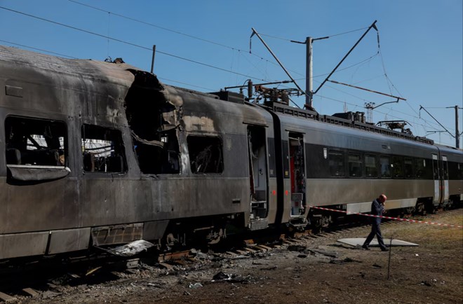 An engineer walks next to a Ukrainian Railways HRCS2 Hyundai Rotem train which was hit by a Russian drone strike, amid Russia’s attack on Ukraine, in Kyiv, Ukraine August 28, 2025. REUTERS/Valentyn Ogirenko TPX IMAGES OF THE DAY Purchase Licensing Rights