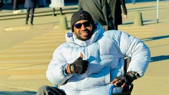 Ahmed Abdulqadir Ahmed, known as Baaba Jeey, gives a thumbs-up while seated in a wheelchair on a bright winter day. The Somali asylum seeker, who has lived in Germany for several months, faces an uncertain future following the country’s recent elections, which saw a rise in anti-immigration sentiment. Despite the challenges, he remains hopeful for a positive outcome. Credit/ Supplied