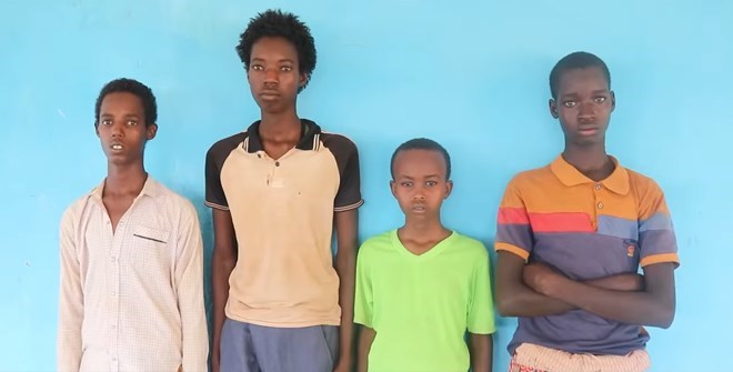 Four Somali children, previously abducted by Al-Shabaab for forced recruitment as child soldiers, stand together after being rescued by security forces in Baidoa, Somalia. Authorities in South West State announced their recovery on February 17, 2025, and are working to reunite them with their families.