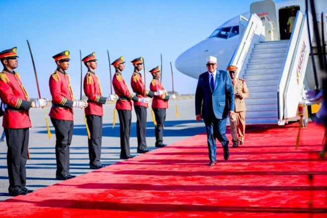 Somaliland President Abdirahman Mohamed Abdillahi (Irro) walks past an honour guard upon his return to Hargeisa following a four-day official visit to the United Arab Emirates, where he discussed bilateral cooperation and major investment initiatives. CREDIT / Supplied