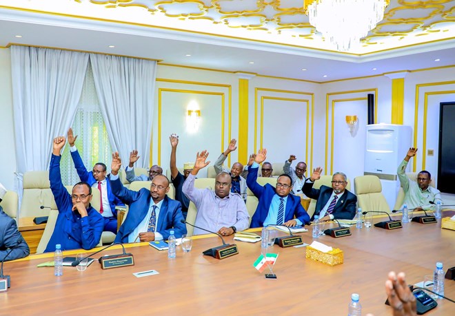 Somaliland’s Council of Ministers unanimously vote to approve key resolutions on security modernization and direct digital tax collection during an extraordinary session in Hargeisa, following President Abdirahman Mohamed Abdillahi (Irro)’s diplomatic visit to the United Arab Emirates. CREDIT/ Somaliland National TV