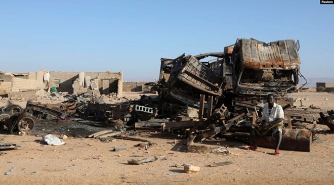 (FILE) A man sits beside the wreckage of burnt military supply vehicles used by suspected Islamic State fighters in Somalia’s Puntland region, Jan. 25, 2025.