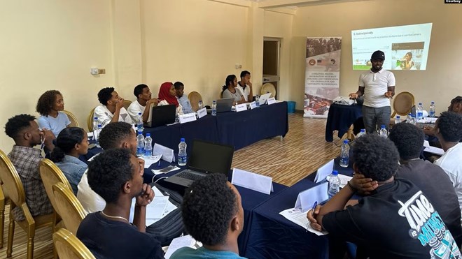 Kirubel Tesfaye, a fact-checker at HaqCheck, leads a training session for journalists and university students in Dire Dawa, Ethiopia, in 2024. (Photo courtesy of HaqCheck)