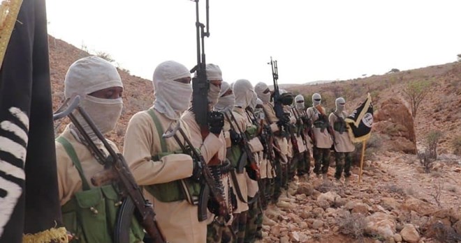 Armed fighters of the Islamic State Somalia Province (ISS) stand in formation in the rugged terrain of northern Somalia, reflecting the group’s growing presence and operational sophistication in the region.