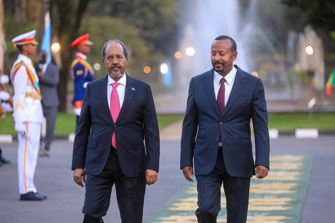 Ethiopian Prime Minister Abiy Ahmed, right, welcomes Somali President Hassan Sheikh Mohamud in Addis Ababa.