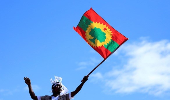 FILE – An Oromo demonstrator waves the OLF flag during a public rally in Ethiopia. The Oromo Liberation Front (OLF) has increasingly criticized the federal government over regional restructuring and alleged marginalization of Oromo communities.