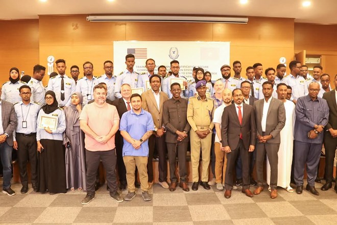 Somalia’s Immigration staff pose with Director General Mustafa Duhulow after completion of the new screening training/HANDOUT
