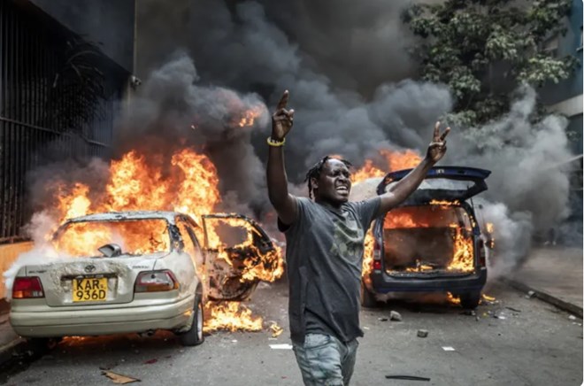 A protester reacts in front of burning cars as clashes erupt between demonstrators and police during a protest over the death of Kenyan blogger Albert Ojwang, who died in police custody [File: Luis Tato/AFP]