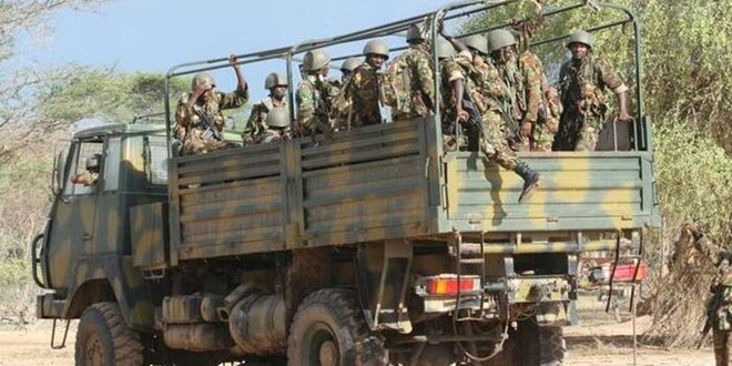 Kenyan troops disembark from a military vehicle at the Kenya-Somalia border in October 2011. Photo