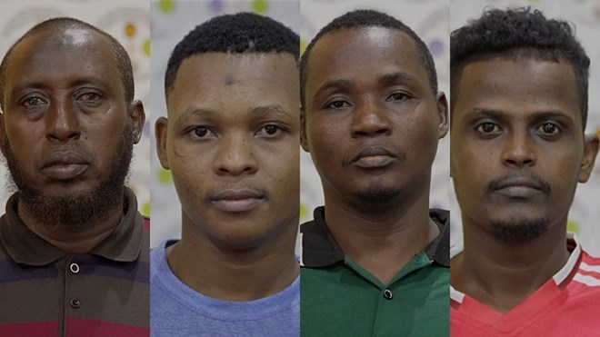 In this handout photo provided by Somalia’s National Intelligence and Security Agency (NISA), four men accused of aiding Al-Shabaab’s vehicle-borne bomb network are shown after being apprehended and brought before the military court in Mogadishu, Somalia. One of the suspects, Abdinasir Mohamed Hassan (far left), was sentenced to life in prison on June 3, 2025.