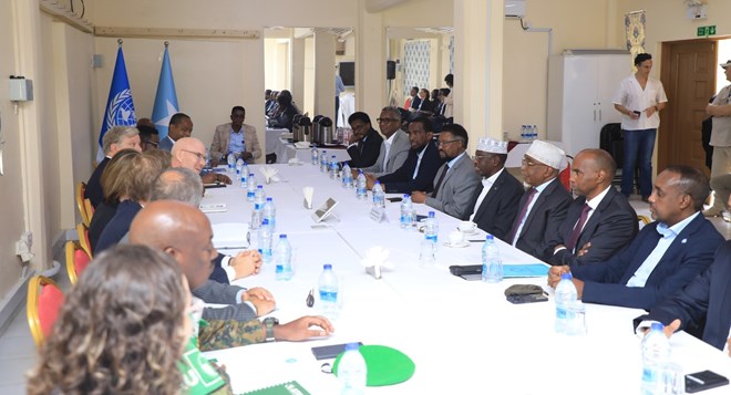 FILE – Members of the Somali Salvation Forum, a coalition of former presidents, prime ministers, and senior political leaders, meet with international partners during a high-level consultation in Mogadishu, Somalia