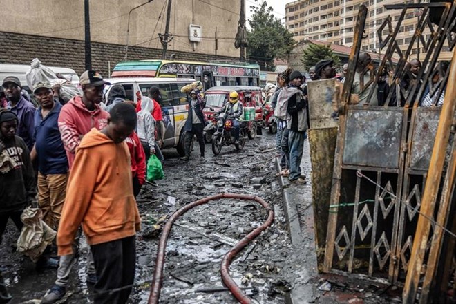 Bystanders and commuters gather in a commercial area that was vandalized and torched during deadly protests marking one year since the storming of parliament in anti-tax demonstrations in Nairobi, Kenya. AFP