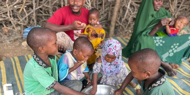 Hussein Idris and his family share a meal in Baidoa camp as they struggle to cope with job loss and