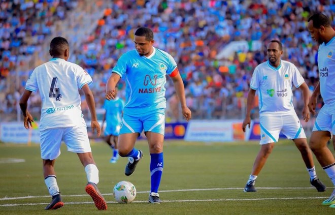 Former Cameroon Striker Samuel Eto’o (C) in action at Mogadishu Stadium, May 27, 2025. /Ministry of Youth and Sports in Somalia