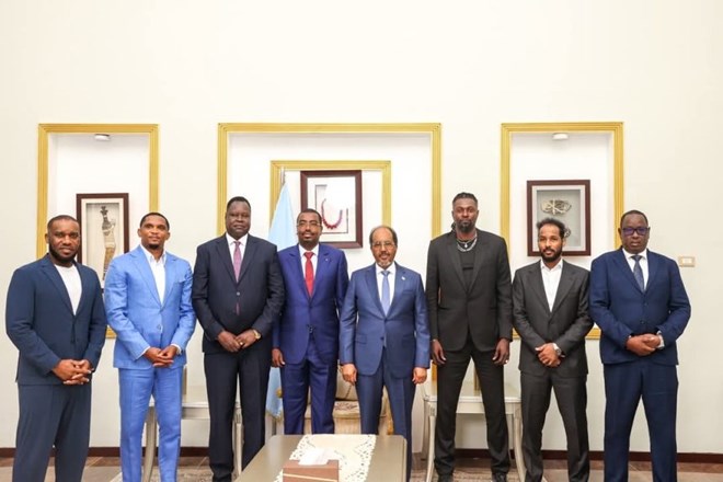 Mogadishu (HOL) — Somali President Hassan Sheikh Mohamud on Wednesday welcomed African football legends Samuel Eto’o, Emmanuel Adebayor, and Jay-Jay Okocha at the Presidential Palace in Mogadishu, marking a powerful moment in Somalia’s efforts to rebuild its global image through sports.
