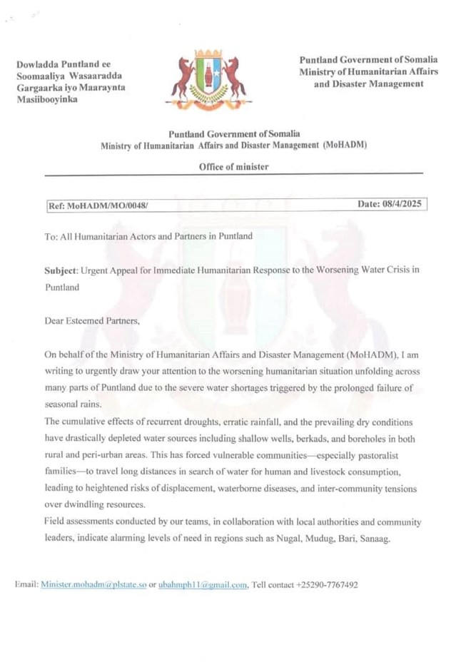 Wasaaradda gargaarka ayaa waxay ugu baaqday hay’adaha samafalka iyo bahwadaagta caalamiga ah in ay si degdeg ah u kordhiyaan taageerada biyo-dhaaminta, dayactirka ceelasha, iyo adeegyada nadaafadda ee muhiimka ah.