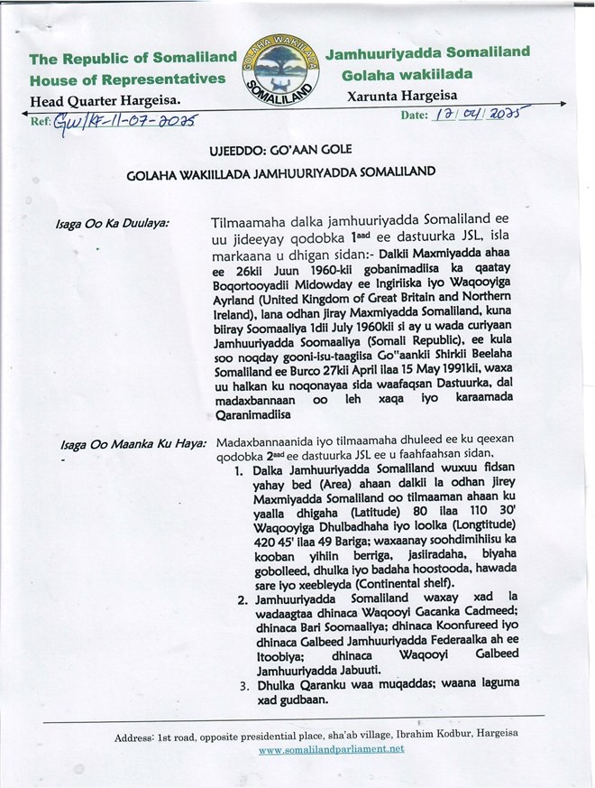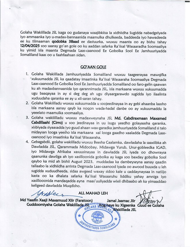 Go’aanka kasoo baxay Golaha ayaa lagu yidhi: “Golaha Wakiillada Jamhuuriyadda Somaliland wuxuu taageerayaa mawqifka xukuumadda JSL ka qaadatay imaanshaha Ra’iisul Wasaaraha Soomaaliya ee Degmada Laascaanood ee Gobolka Sool, taas oo uu goluhu ku tilmaamay faragelin qaawan oo ku ah madaxbannaanida iyo qaranimada JSL.”