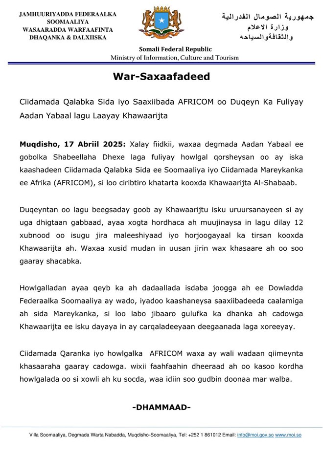 “Ciidamada Qaranka iyo howlgalka AFRICOM waxay wali wadaan qiimeynta khasaaraha gaaray cadowga. wixii faahfaahin dheeraad ah oo kasoo kordha howlgalada oo si xowli ah ku socda, waa idiin soo gudbin doonaa mar walba” ayaa lagu yiri Warsaxafadeedka.