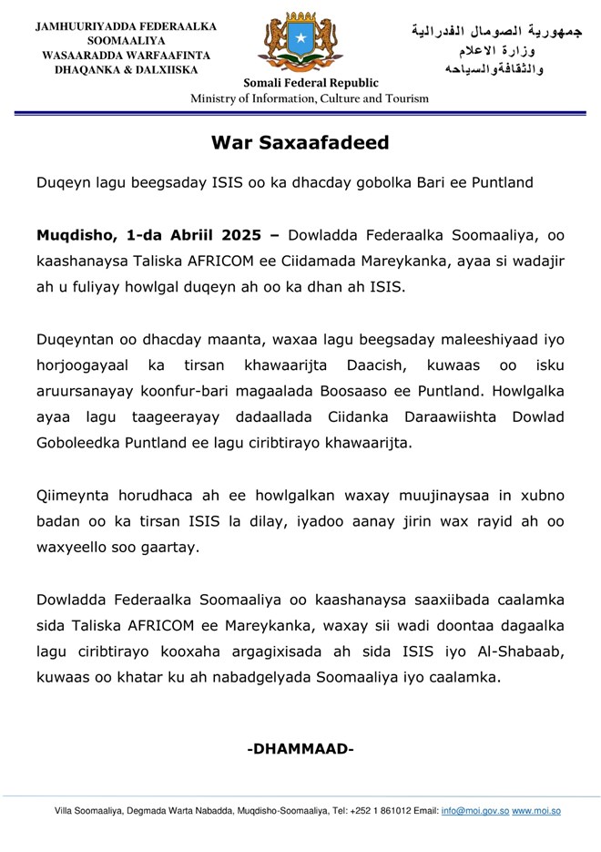 Warsaxafadeed kasoo baxay Wasaaradda Warfaafinta Xukuumadda Fedaraalka Soomaaliya ayaa lagu sheegay in duqeynta si gaar ah loogu beegsaday maleeshiyaad iyo horjoogayaal ka tirsan Daacish oo isku aruursanayay Koonfur bari magaalada Boosaaso.