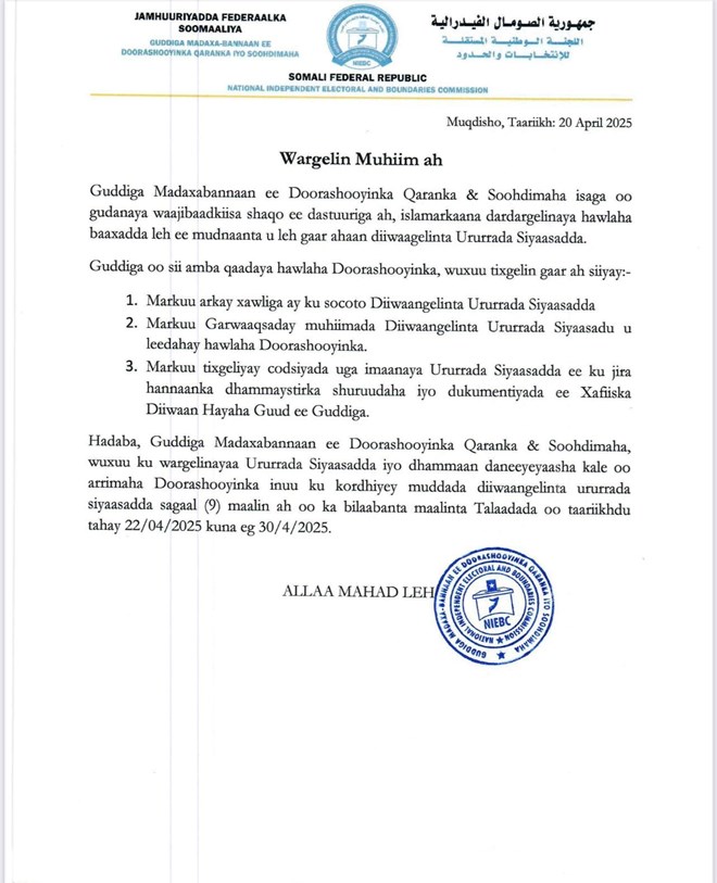 Waxa uu Guddiga xusay in muddada 9 ka maalmood ah ay ka bilaaban doonto maalinta Talaadada oo taarikhdu tahay 22/04/2025 kuna eg 30/4/2025, waana markii 2aad uu Guddiga uu waqti kale oo dheeri ah ku kordhinayo diiwaangelinta Ururada Siyaasadda.