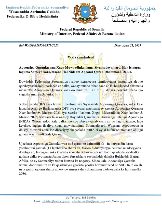 Wasaaradda ayaa sheegtay inay ku boorineyso  madaxda Puntland in ay si qaranimo leh uga qeybqaataan hirgelinta Aqoonsiga Qaranka, ayna bulshada deegaanka uga faa’iideeyaan nidaamka qaran ee horey loo dhisay.
