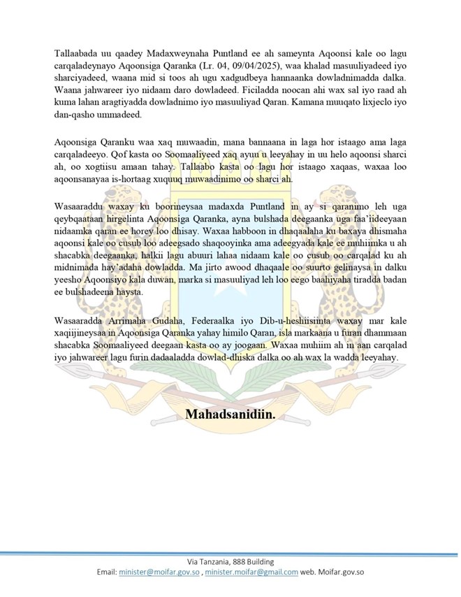“Tallaabada uu qaadey Madaxweynaha Puntland ee ah sameynta Aqoonsi kale oo lagu carqaladeynayo Aqoonsiga Qaranka (Lr. 04, 09/04/2025), waa khalad masuuliyadeed iyo sharciyadeed, waana mid si toos ah ugu xadgudbeya hannaanka dowladnimadda dalka, Waana jahwareer iyo nidaam daro dowladeed, Ficiladda noocan ahi wax sal iyo raad ah kuma lahan aragtiyadda dowladnimo iyo masuuliyad Qaran. Kamana muuqato lixjeclo iyo dan-qasho ummadeed” ayaa lagu yiri warka kasoo baxay Wasaaradda arrimaha Gudaha Soomaaliya.