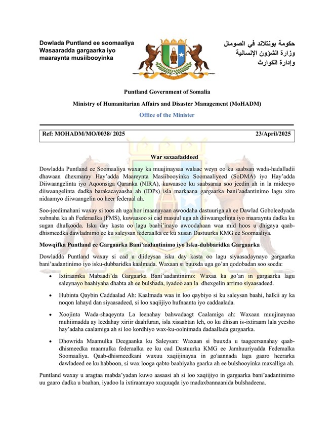 “Dowladda Puntland ee Soomaaliya waxay ka muujinaysaa walaac weyn oo ku saabsan wada-hadalladii dhawaan dhexmaray Hay’adda Maareynta Masiibooyinka Soomaaliyeed (SoDMA) iyo Hay’adda Diiwaangelinta iyo Aqoonsiga Qaranka (NIRA), kuwaasoo ku saabsanaa soo jeedin ah in la mideeyo diiwaangelinta dadka barakacayaasha ah (IDPs) isla markaana gargaarka bani’aadantinimo lagu xiro nidaamyo diiwaangelin oo heer federaal ah,” ayaa lagu yiri war-saxaafadeedka.