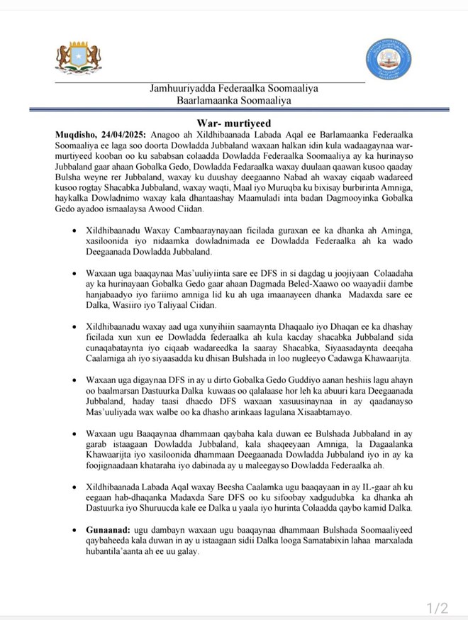 “Waxaan si adag u cambaareyneynaa falalka guracan ee lagu beegsanayo amniga iyo xasilloonida shacabka Jubbaland. Dowladda Federaalka waxaa la gudboon in ay joojiso faragelinta militari iyo hanjabaadaha joogtada ah ee ka imaanaya madaxda sare ee dowladda, wasiiro iyo taliyaal ciidan,” ayaa lagu yiri war-saxaafadeedka.