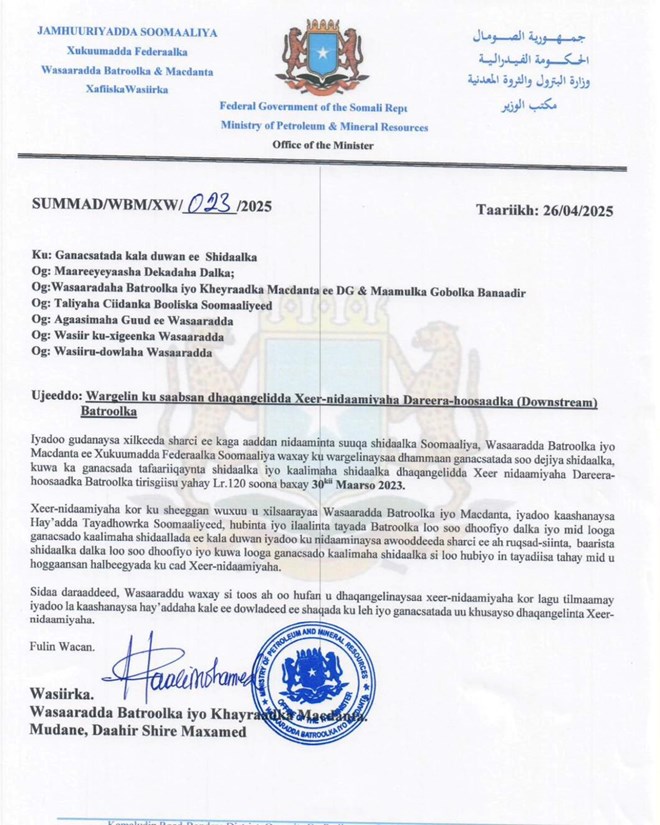 Wasaaradda ay war ay maanta soo saartay ku sheegtay in arintaan ay tahay mid waajib ka saaran Wasaaradda ayna qaaday tallaabadaani Iyadoo gudanaysa xilkeeda sharci ee kaga aaddan nidaaminta suuqa shidaalka Soomaaliya si kor loogu qaado tayada shidaalka imaanaya dalka iyo isku dheelitirnaanta suuqa.