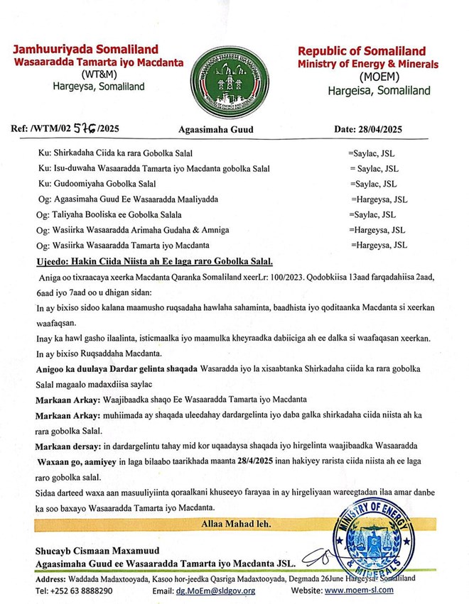 “Waxaan go’aamiyay in taariikhda maanta 28, 4, 2025 aan joojiyay ciidda niista ah ee laga raro gobolka Salal. Sidaa darteed, waxaan masuuliyiinta uu qoraalkani khuseeyo farayaa inay hirgeliyaan wareegtadan, ilaa amar dambe kasoo baxayo Wasaaradda Tamarta iyo Macdanta,” ayaa lagu yidhi wareegtada.