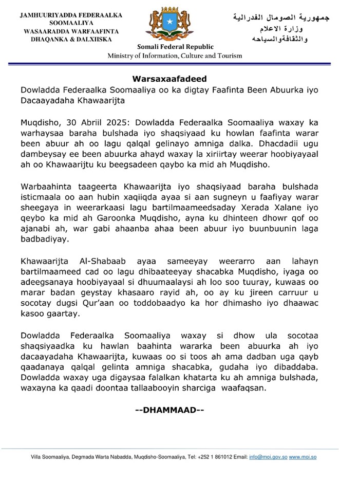 Arbaco, April 30, 2025 (HOL) – Dowladda Soomaaliya ayaa sheegtay in ay ka warhayso baraha bulshada iyo shaqsiyaad ku howlan faafinta warar been abuur ah oo lagu qalqal gelinayo amniga Soomaaliya gaar ahaan marka ay timaado madaafiicda lagu soo garaaco Muqdisho.
