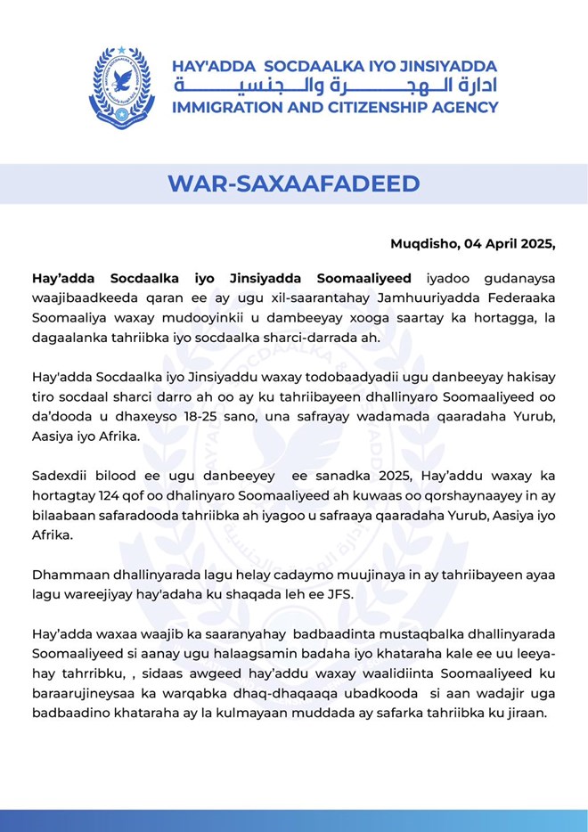 Warka kasoo baxay Hay’adda ayaa sidoo kale shaaca looga qaaday in Sadexdii bilood ee ugu danbeeyey ee sanadka 2025, ay ka hortagtay 124 qof oo dhalinyaro Soomaaliyeed ah kuwaas oo qorshaynaayey in ay bilaabaan safaradooda tahriibka.