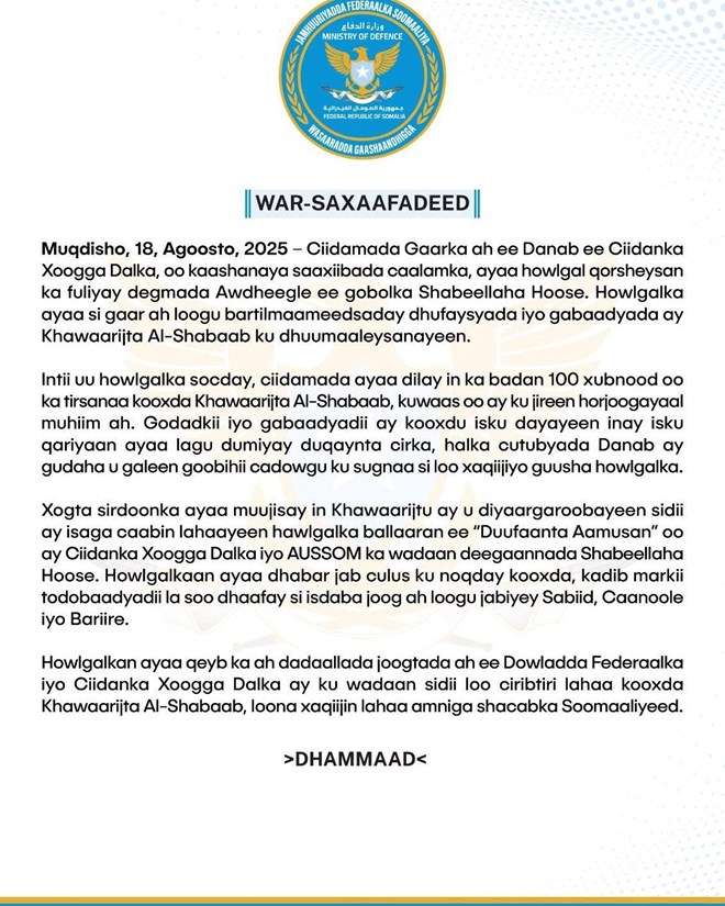Talaado, Agoosto 19, 2025 (HOL) – Ciidamada xoogga dalka, gaar ahaan kuwa Kumaandooska Danab oo kaashanaya saaxiibada caalamka ayaa howlgal qorsheysanaa oo dhanka cirka ah ka fuliyay degmada Awdheegle ee gobolka Shabeellaha Hoose.
