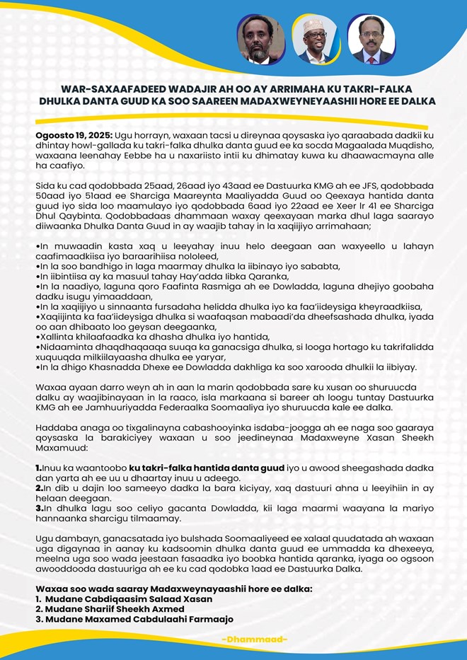 Talaado, Agoosto 19, 2025 (HOL) – Madaxweynayaashii hore ee Soomaaliya, Cabdiqasim Salad Xasan, Sharif Sheikh Axmed, iyo Maxamed Cabdullahi Farmaajo, ayaa si wadajir ah u soo saaray war-saxaafadeed ay uga digayaan Madaxweynaha hadda talada haya, Xasan Sheikh Maxamuud, tallaabooyinka lagu barakicinayo muwaadiniin danyar ah oo deganaa dhul dan guud.