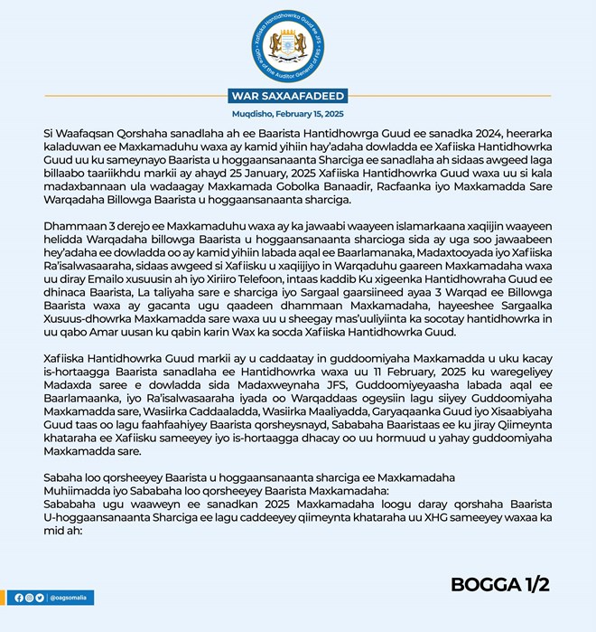 Warka kasoo baxay xafiiska hanti dhowraha Qaranka ayaa lagu yiri “Si Waafaqsan Qorshaha sanadlaha ah ee Baarista Hantidhowrga Guud ee sanadka 2024, heerarka kaladuwan ee Maxkamaduhu waxa ay kamid yihiin hay’adaha dowladda ee Xafiiska Hantidhowrka Guud uu ku sameynayo Baarista u hoggaansanaanta Sharciga ee sanadlaha ah sidaas awgeed Xafiiska Hantidhowrka Guud waxa uu si kala madaxbannaan ula wadaagay Maxkamada Gobolka Banaadir, Racfaanka iyo Maxkamadda Sare Warqadaha Billowga Baarista u hoggaansanaanta sharciga”.