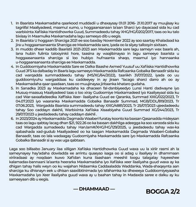 Waxaana ka dhalatay dhammaan arrimahaani oo dhami in Xafiiska Hantidhowrka Guud ay u caddaatay in guddoomiyaha Maxkamadda u ku kacay is-hortaagga Baarista sanadlaha ee Hantidhowrka waxa uu 11 February, 2025 ku waregeliyey Madaxda saree e dowladda sida Madaxweynaha JFS, Guddoomiyeyaasha labada aqal ee Baarlamaanka, iyo Ra’isalwasaaraha.