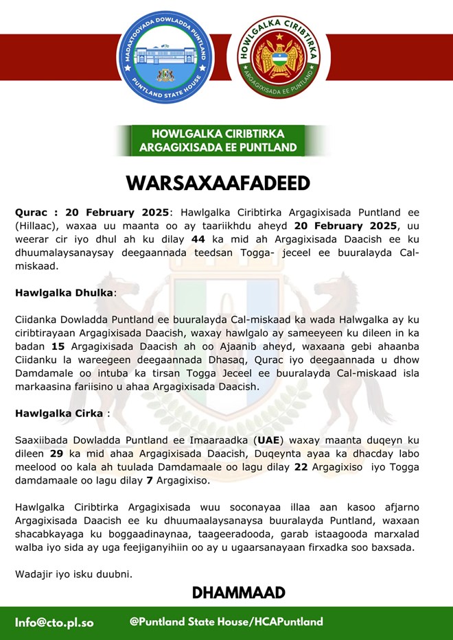 Khamiis, February 20, 2025 (HOL) – Ciidanka La-dagaalanka Argagixisada Puntland ayaa la wareegay deegaannada Dhaqas, Qurac, iyo Damdamle, kuwaas oo ka tirsan Buuraha Calmiskaad ee gobolka Bari, halkaas oo muddo 7 sano ah farriisin u ahayd Daacish.