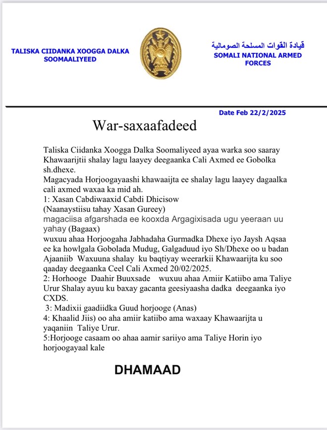 Sabti, February 22, 2025 (HOL) – Taliska ciidanka xoogga dalka Soomaaliyeed ayaa faahfaahin dheeraad ah ka bixiyay khasaaraha ka dhashay dagaalo culus oo ka dhacay deegaano ka tirsan gobolka Shabeellaha Dhexe.