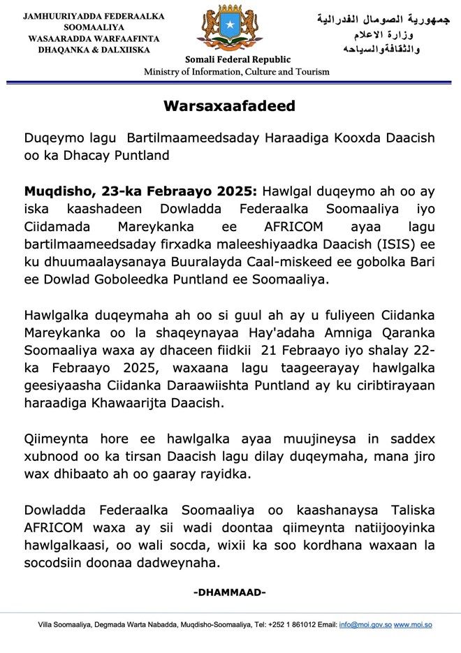 Sida ay sheegtay dowladda Soomaaliya, duqeymaha ayaa billowday fiidkii Feberaayo 21 illaa maalintii xigtay ee Feberaayo 22, 2025, iyada oo lagu beegsanayay xubnaha ISIS ee ku dhuumaalaysanaya dhulka buuraleyda fog ee Puntland.