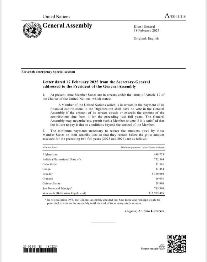 Sida ku cad warqad uu Xoghayaha Guud António Guterres u diray Madaxweynaha Golaha Guud ee Qaramada Midoobay 17-kii Febraayo 2025, sagaal waddan ayaa hadda lagu leeyahay deymo gaarsiisan heerka ay luminayaan codkooda, haddii aan la bixin tabarucaadka lagu leeyahay.