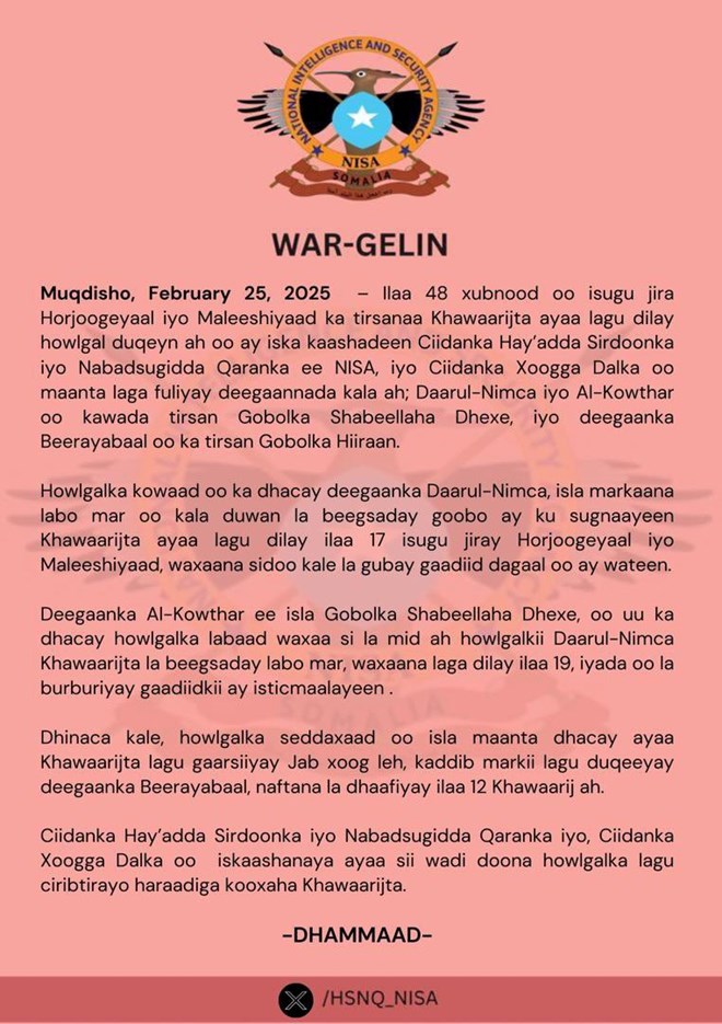Hoos ka akhriso Warsaxafadeedka kasoo baxay NISA oo dhameystiran:-