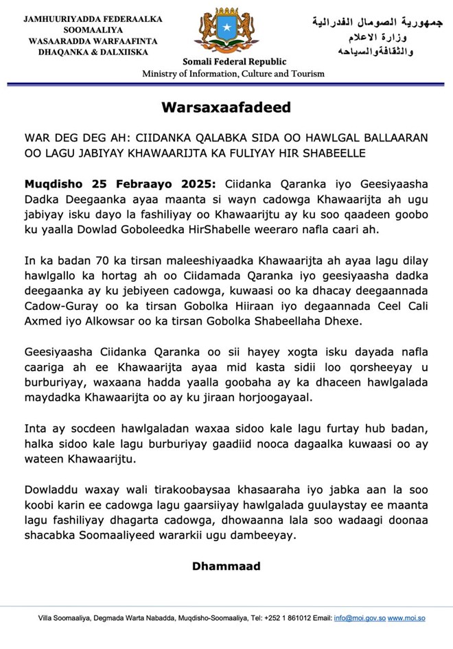 Talaado, February 25, 2025 (HOL) – War saxaafadeed ay soo saartay wasaaradda warfaafinta Soomaaliya ayaa lagu faah faahiyay khasaaraha ka dhashay dagaalo xoogan oo maanta ka dhacay gobolka Shabeellaha Dhexe, waxaana lagu xusay in inkabadan 70 Dagaalame iyo horjoogayaashoodi Al shabaab ah lagu dilay Dagaalada oo ay barbar socdeen Duqeymo.