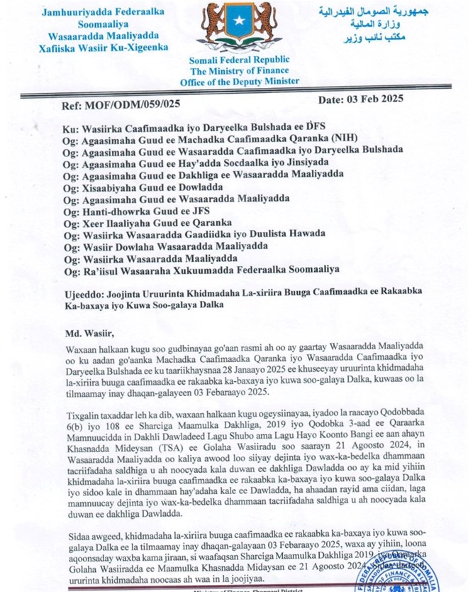 War-saaafadeed kasoo baxay wasaaradda Maaliyadda ayaa lagu sheegay in dib u eegis lagu sameeyey go’aanka Machadka Caafimaadka Qaranka iyo Wasaaradda Caafimaadka, kaas oo la sheegay inuu dhaqan-gali lahaa 03 Febaraayo 2025.